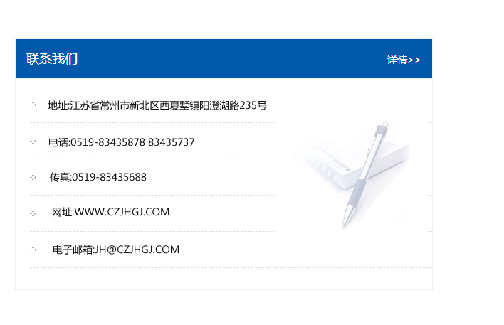 地址:常州市新北區(qū)友邦商務(wù)大廈1幢16、17層  電話:0519-85101652  傳真:0519-85112595  郵編:213022  網(wǎng)址:www.cz-jiayue_cn.thshiye.com  郵箱:xiajifengaa@163.com